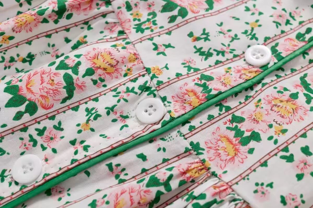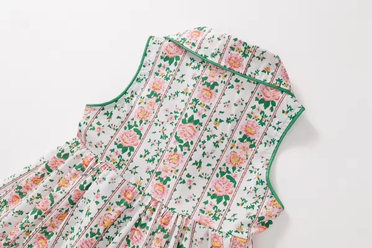 襟付きプリント ワンピース 子供服 女の子 キッズ ガーリー かわいい 春 夏 花柄 フラワー ノースリーブ 袖なし ストライプ柄 花柄 総柄 前開き プリンセス お姫様 90 100 110cm 120cm 130cm 140cm