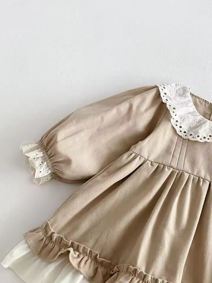 ベビー キッズ 韓国子供服 70 80 90 100 110 秋 春 レース襟 レース袖 刺繍 ワンピ ドレス 女の子フローラル ナチュラル ベージュ 淡色 コーデ コーディネート