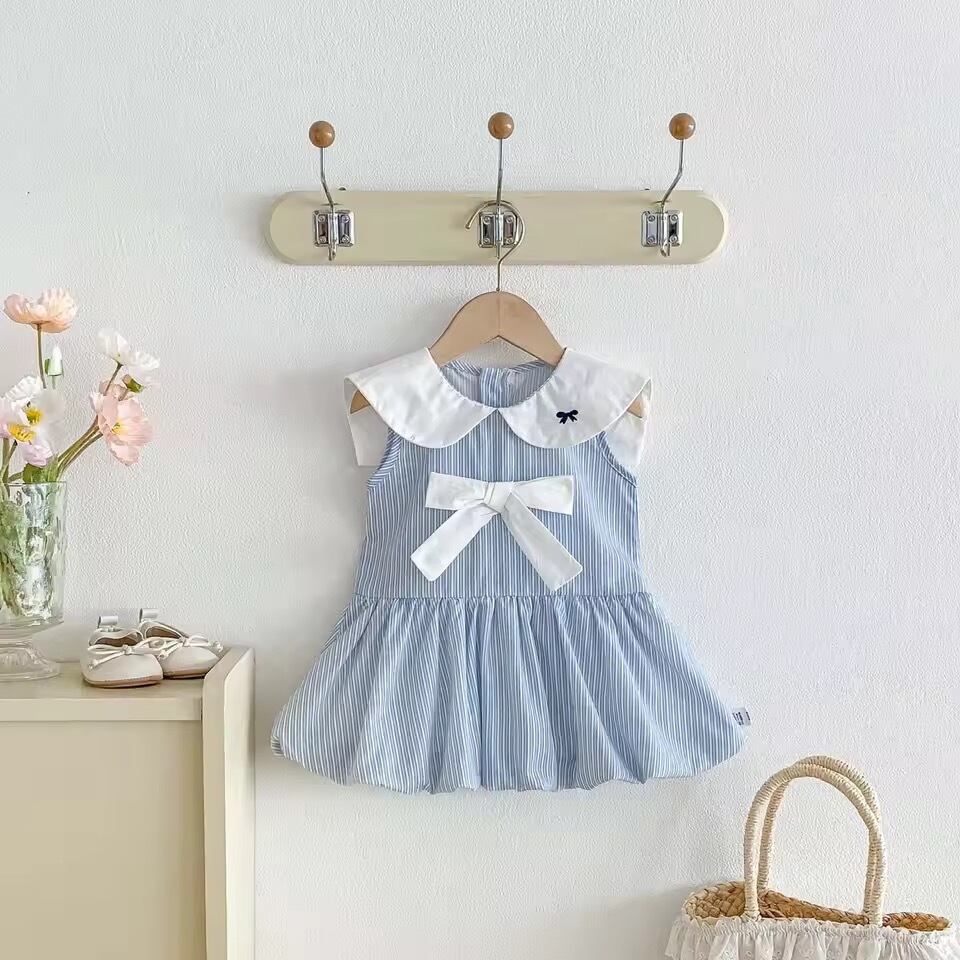 カバーオール ベビー 女の子 ロンパースワンピース 大きなリボン 学院風 襟付き おしゃれ かわいい ノースリーブ 夏物 薄手 ライトブルー お出かけ 普段使い