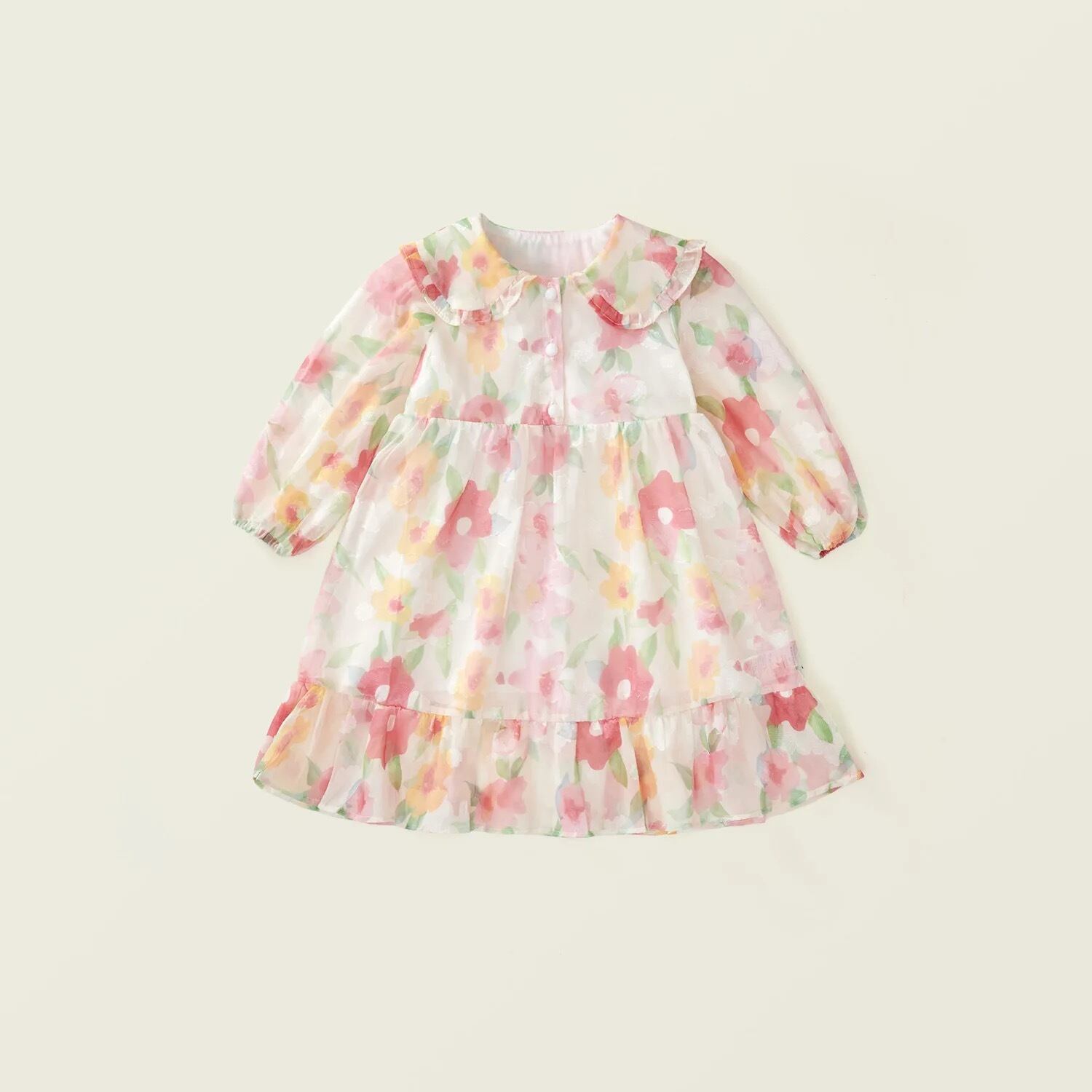 韓国こども服 シフォン ワンピース 春秋 花柄 ロング丈 女の子 子供ドレス プリント 長袖 リゾート おしゃれ ビーチ カジュアル 可愛い ジュニア服 卒園式 入学パーティ 90 100 110 120 130 140