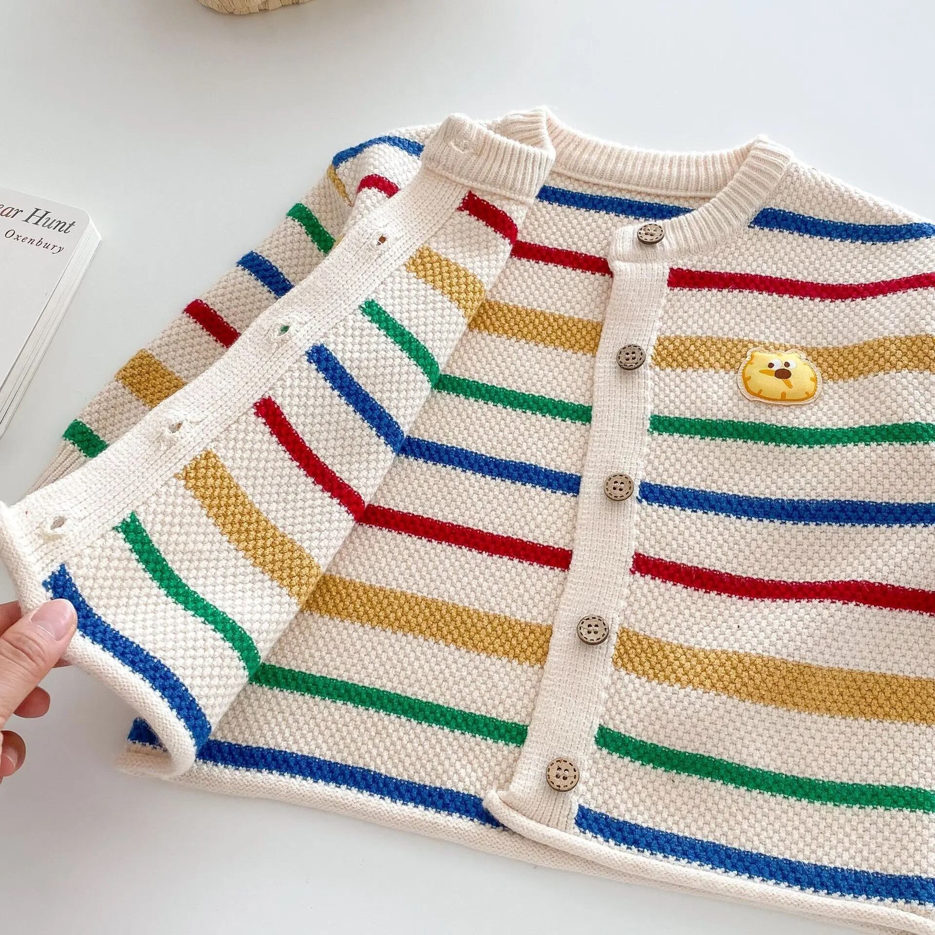 キッズ カーディガン 男の子 女の子 春秋 子供 幼児 ジュニア ベビー 長袖 ラウンドネック ニット 柔らかい カラフル シンプル かわいい 赤 黄 青 ボーダー