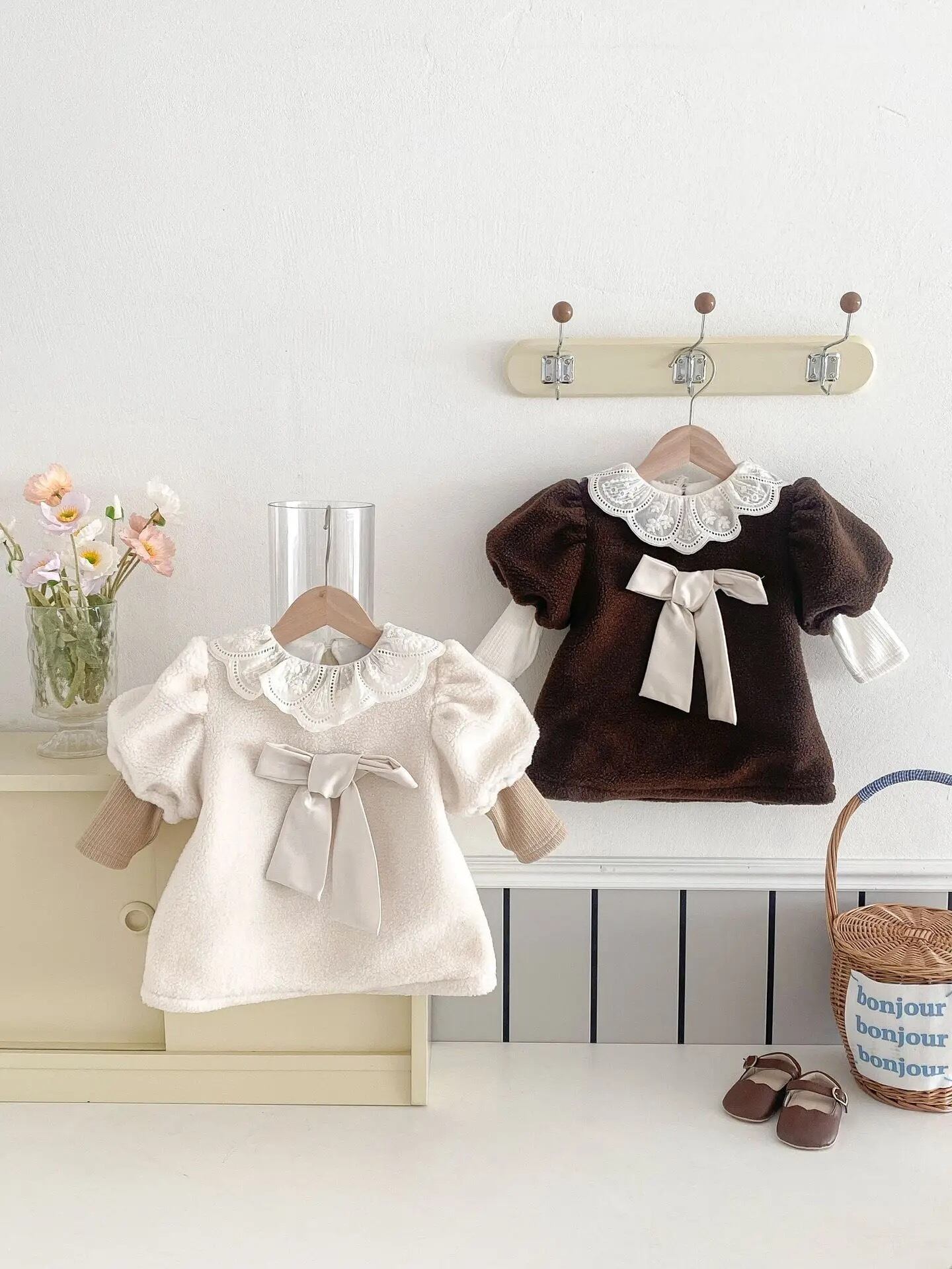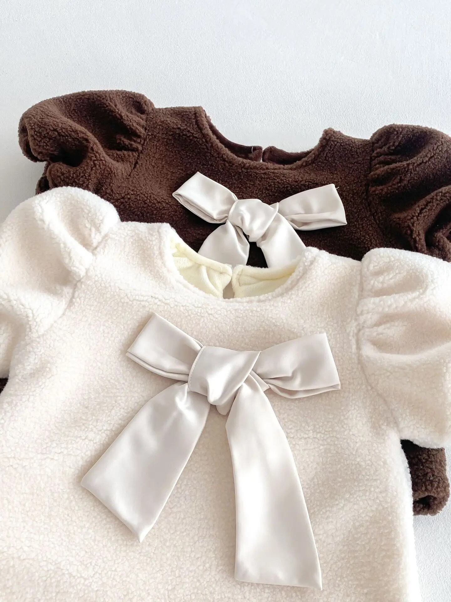 冬リボン付きフリースボアバルーンスリーブワンピース
