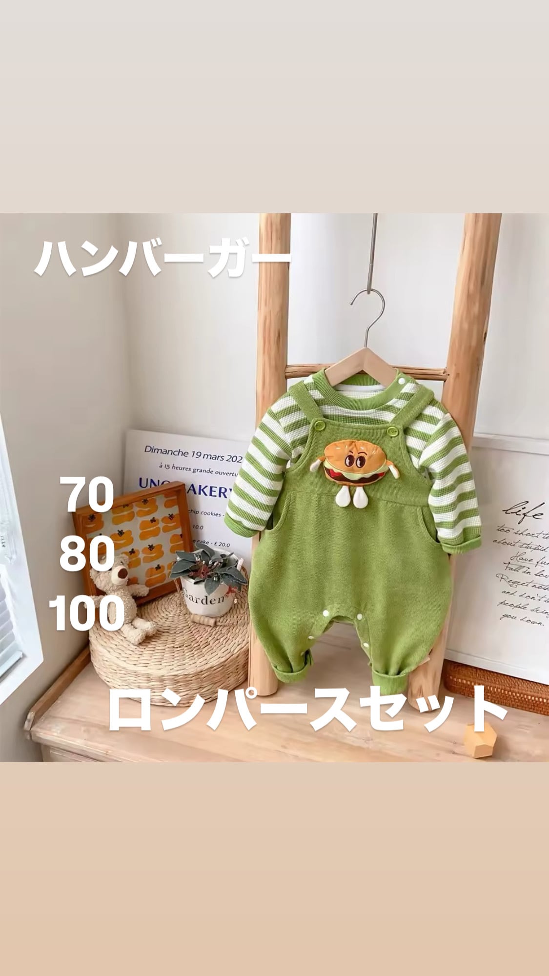 ロンパース かわいい ベビー ウェア カバーオール 幼児 春秋 ハンバーガー ポケット 生後 1ヶ月 赤ちゃん 外出用 100日祝い ボーダー ジャンプスーツ 70cm 80cm 100cm
